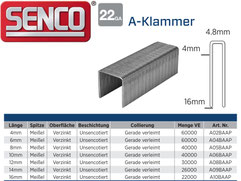 Unsere SENCO Klammer A ist eine Dünndrahtklammern für einfache Anwendungen. Typische Anwendungszwecke sind Polsterarbeiten, das Befestigen von Stoffen und Leder, die Schuhindustrie, Möbel und Spielzeug sowie Blisterverpackungen.